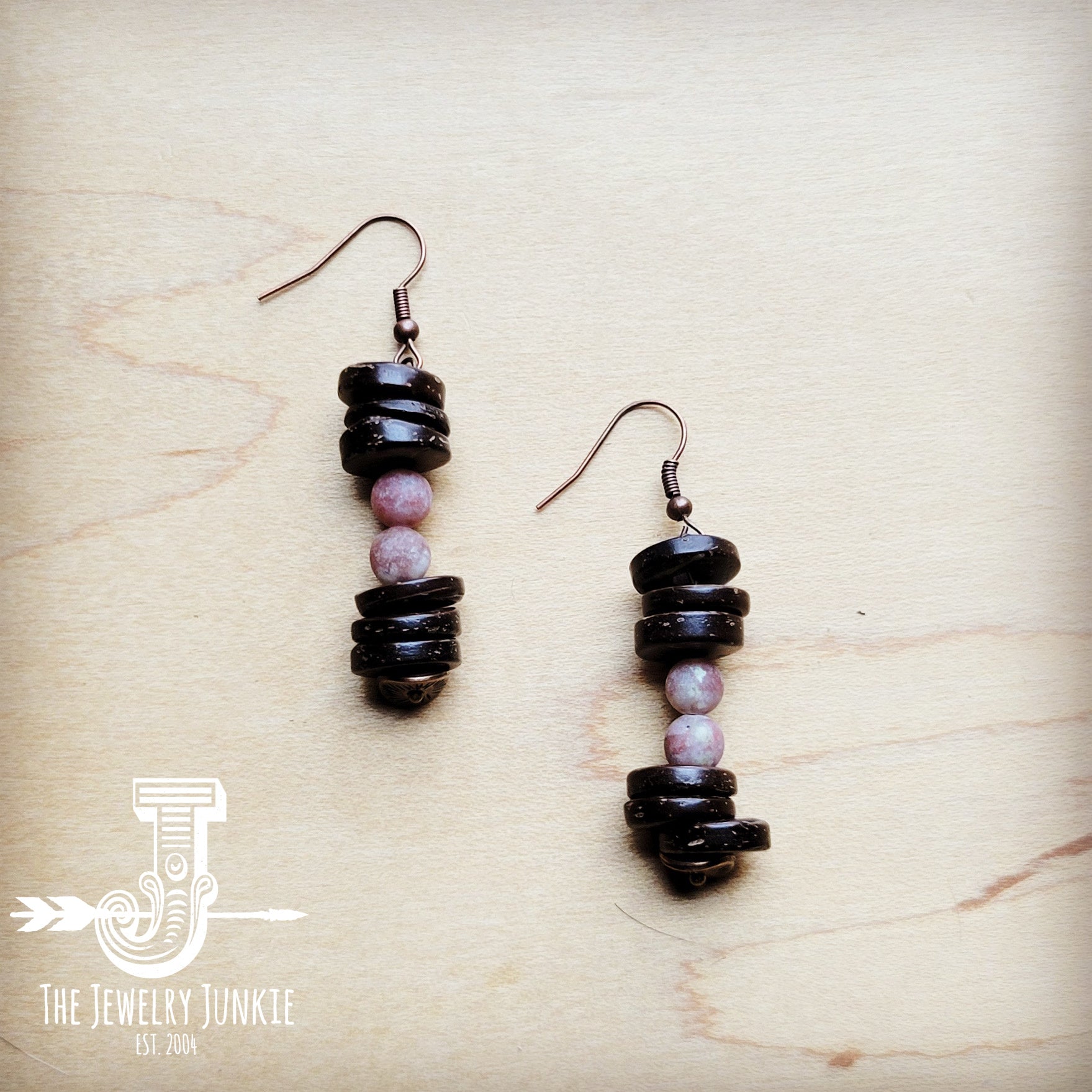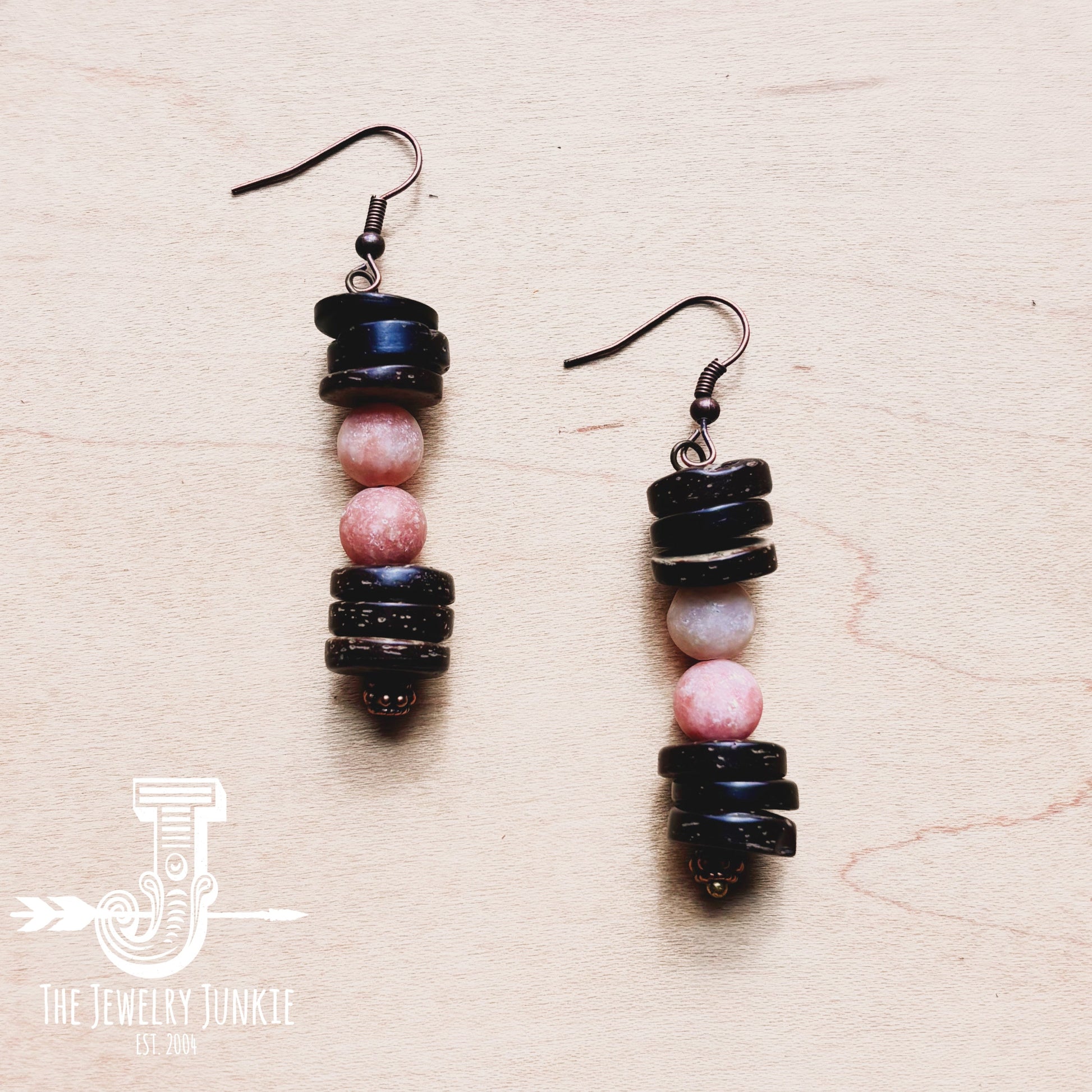 These artisan earrings are made by hand with genuine Frosted Marble Jasper stones and wooden discs for a unique bohemian look. These handcrafted earrings complete any boho chic outfit, with neutral tones and beautiful mauve accents. Pair them with a boho statement necklace and handmade beaded bracelets, or wear them by themselves to draw attention to your eyes. You’ll only find these artisan earrings online at The Jewelry Junkie!