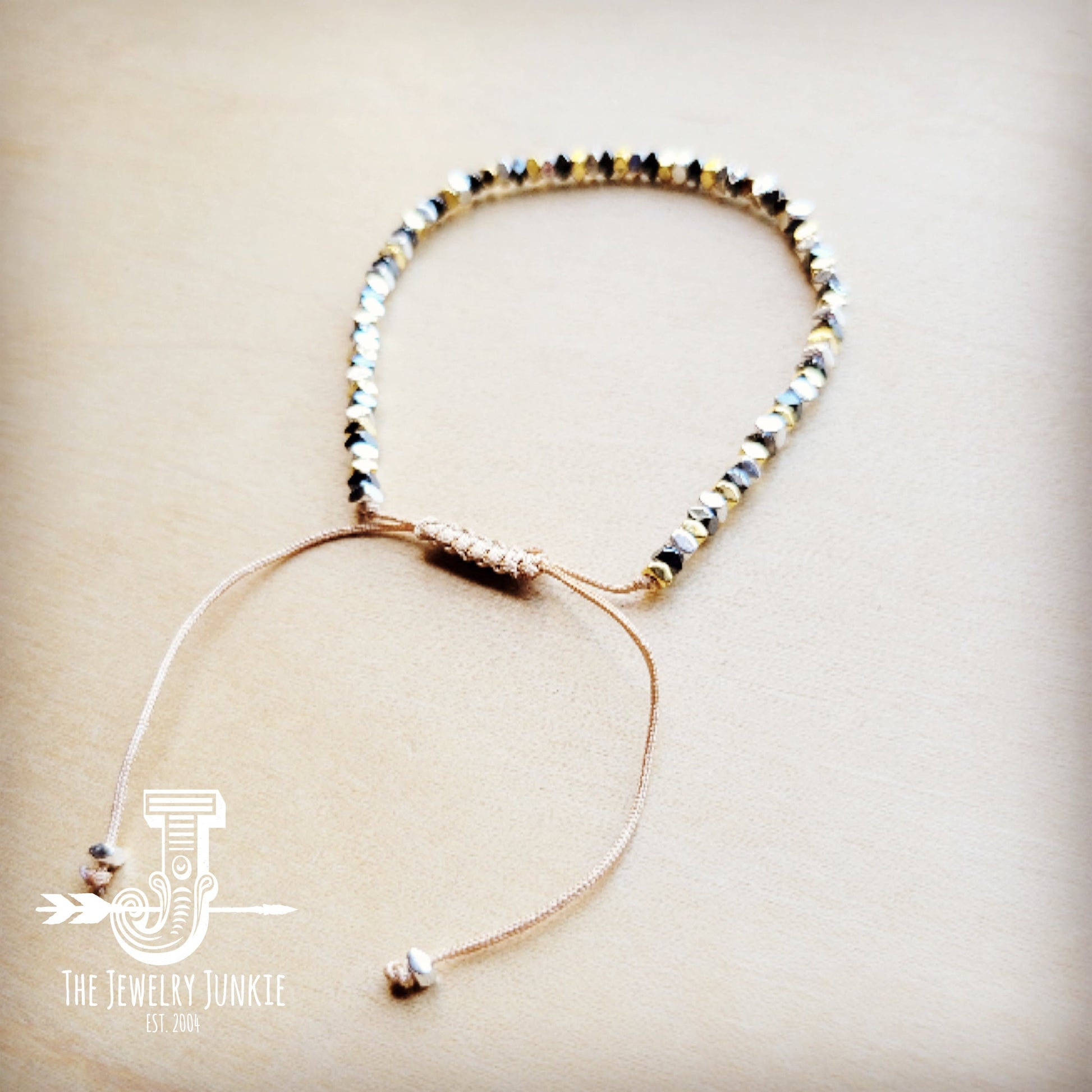 Expertly crafted and adjustable, this multi-colored faceted electroplate beaded bracelet adds a touch of elegance to any outfit. Its stackable design allows for effortless mixing and matching, making it a versatile addition to your accessory collection. Elevate your style with this handcrafted woven bracelet.